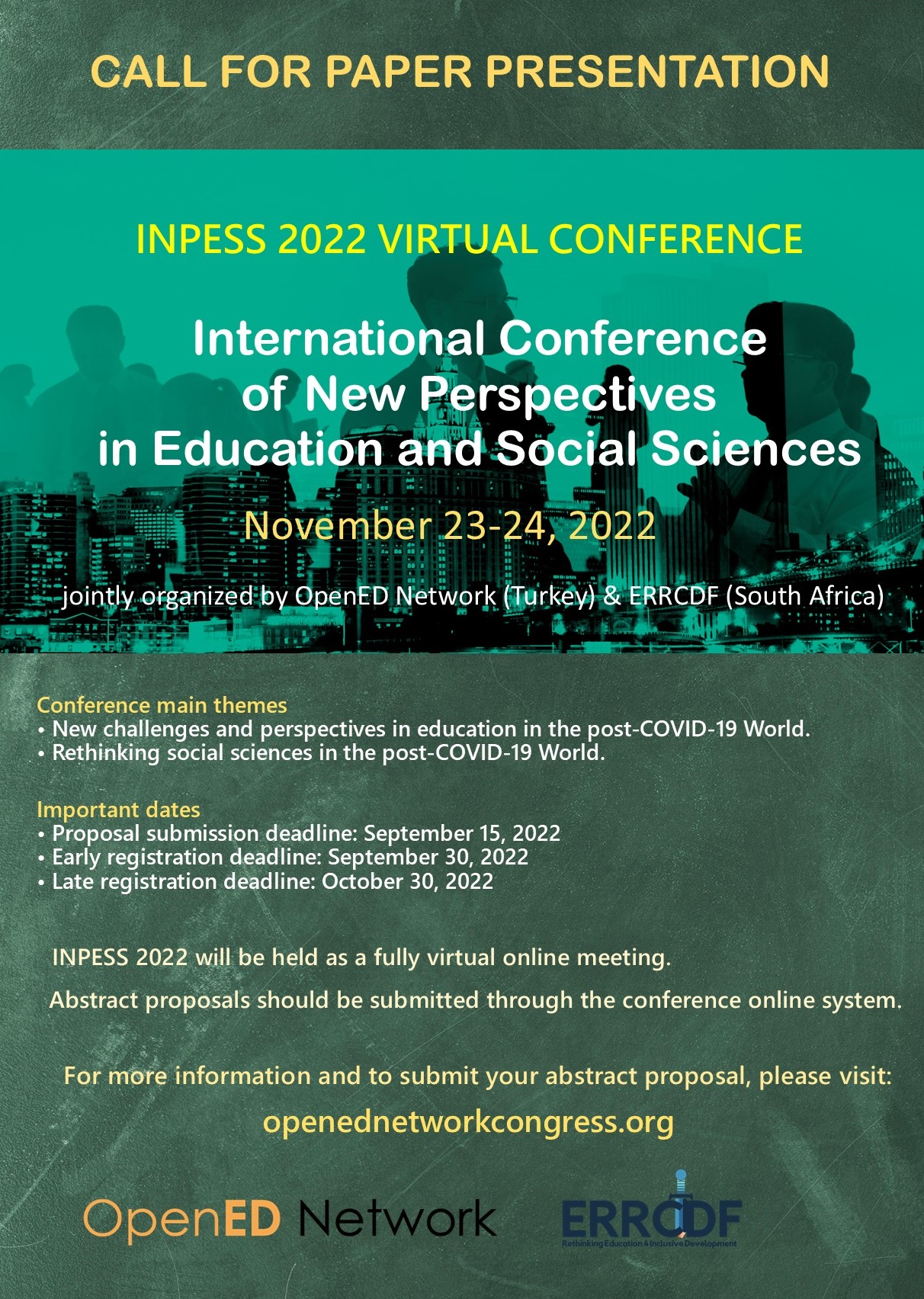You are invited to participate in the International Conference of New Perspectives in Education and Social Sciences (INPESS 2022). The Conference will be held as a fully virtual/online meeting on November 23-24, 2022.